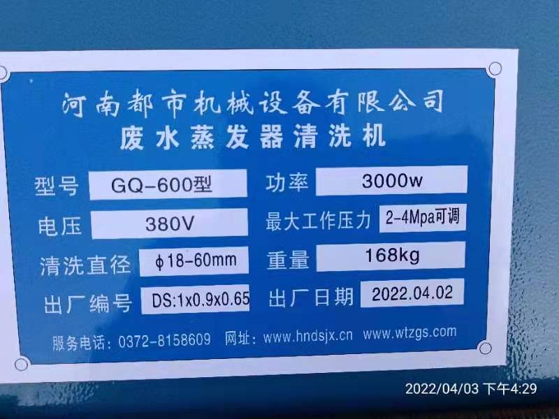 2022年4月1日,衡水酷祥生物科技有限公司糠醛廠(原河北省衡水誠(chéng)碩化工有限公司),在王總的精心安排下,韓總,張主任,全廠職工共同努力配合河南都市機(jī)械設(shè)備有限公司喬主任,發(fā)明了一項(xiàng)新的工具,使用兩臺(tái)GQ—600型智能清洗機(jī)鉆洗管子內(nèi)徑40毫米長(zhǎng)度5米1800根結(jié)垢堅(jiān)硬,徹底堵死,好久沒(méi)有通透過(guò)的1000平方廢水蒸發(fā)器,為糠醛行業(yè)開(kāi)辟了新的道路。歡迎大家關(guān)注分享指導(dǎo)合作共贏!